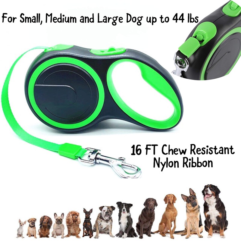 • 16 ft CHEW RESISTANT NYLON RIBBON - This heavy duty retractable dog leash features a 16 ft reinforced nylon ribbon that is extremely durable and chew resistant