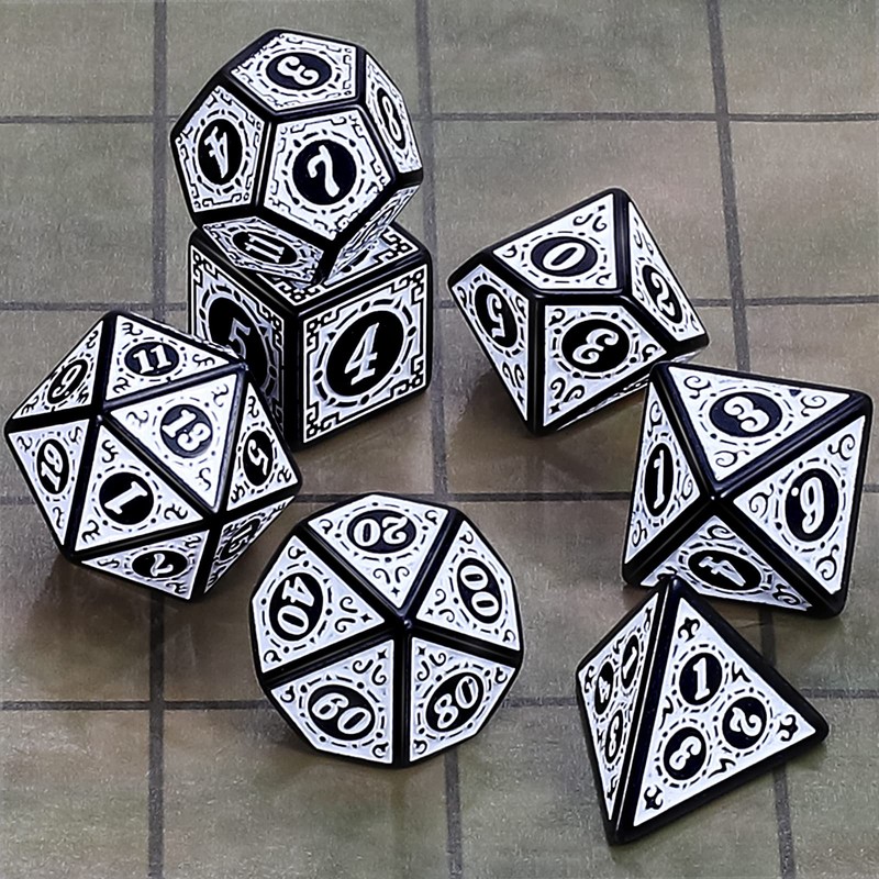 - 🎲 7pcs Polyhedral dice set: Contains one d20, one d12, two d10 (00-90 and 0-9), one d8, one d6 and one d4 and a velvet dice bag.