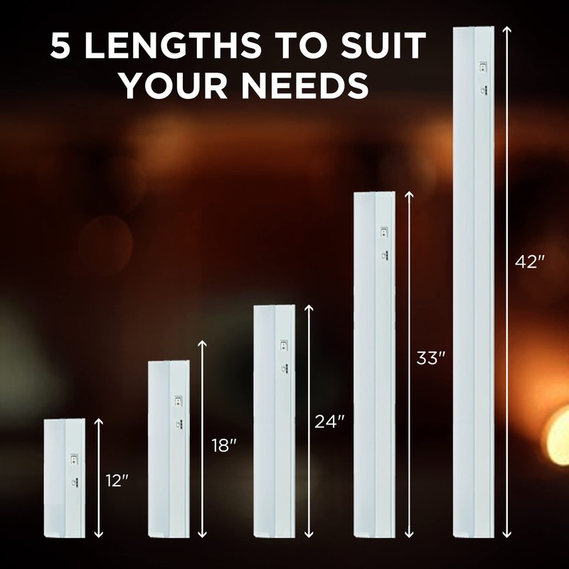 - Customizable Choices - Need a large 24 inch LED light fixture or just a set of small under kitchen cabinet lights? We offer 5 lighting sizes with varying brightness, so you can customize the lighting needs of any space. All lights are linkable and 3.5 inches wide by 1 inch deep and range in length from 12 inches to 42 inches long. Whether your cabinet space is big or small, you'll have the selection you need for the ultimate lighting experience.