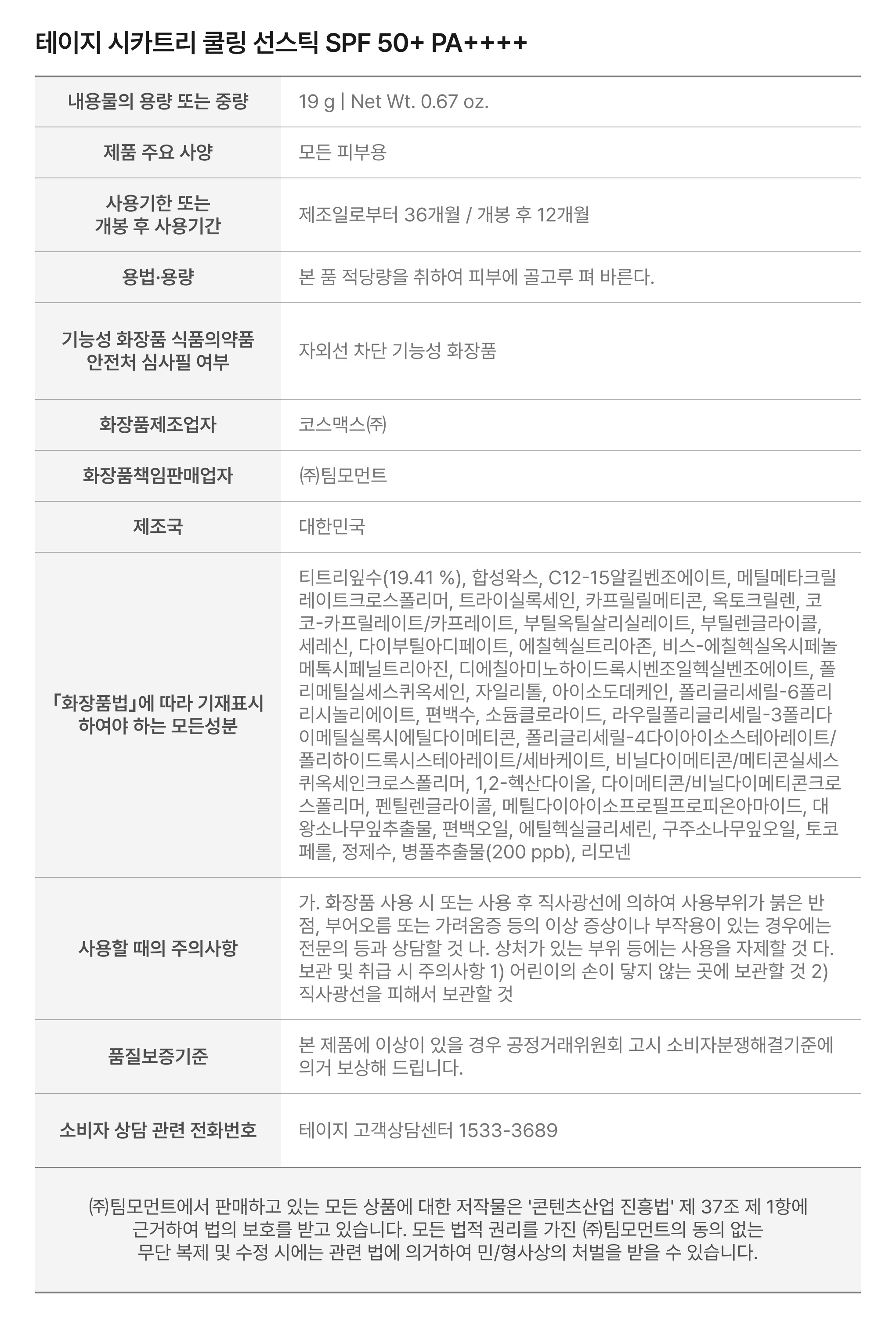 Cicatree Cooling Sun Stick 19g SPF50+ PA++++ / 시카트리 쿨링 선스틱 19g SPF50+ PA++++
