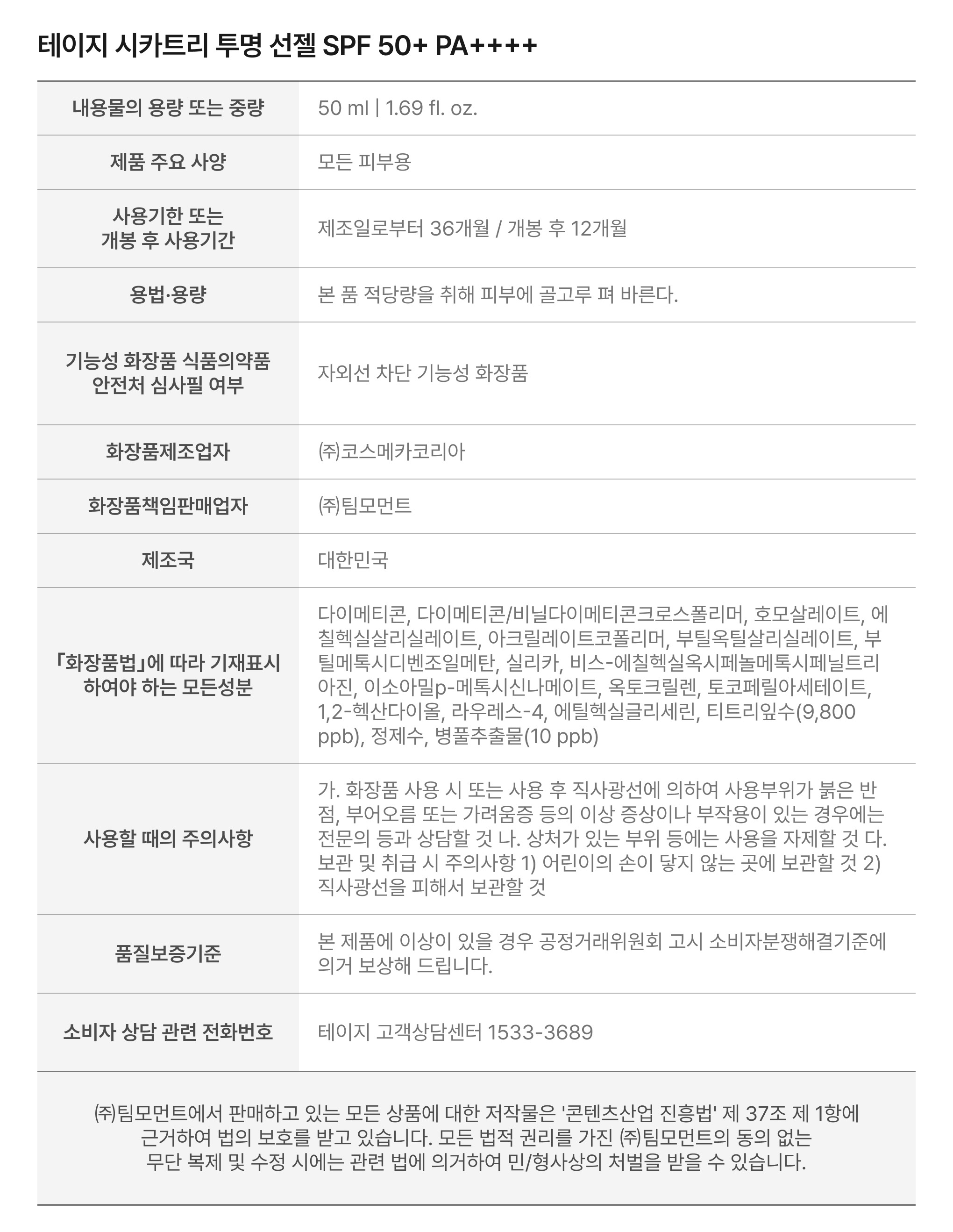 Cicatree Transparent Sun Gel 50ml SPF50+ PA++++ / 시카트리 투명 선젤 50ml SPF50+ PA++++