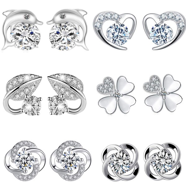 CICINIO - Juego de aretes para mujer, 6 pares de aretes con circonita cúbica, de plata de ley 925, hipoalergénico, redondo.