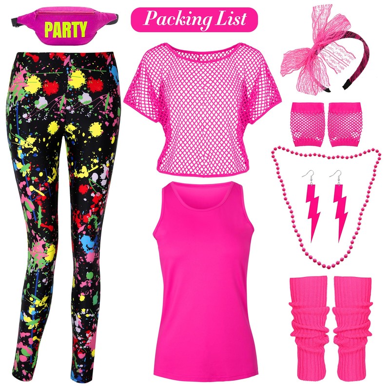 - Full set 80s 90s Outfit For Women: includes 1 pcs retro 80s fishnet Top, 1 pcs Vest, 1 pcs pants,1 pcs leg warmers, 1 pcs necklace,1 pcs Earrings, 1 pcs headband, 1 pair of gloves and 1 pcs fanny pack, which can satisfy your needs for 80s costume accessories.