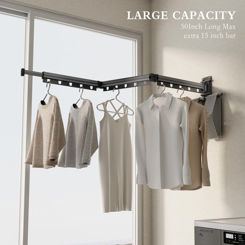 - 【LARGE CAPACITY】Our clothes drying rack is 50 inches long,has an extra 15 inch bar and has 15 fixing hook holes, you can hang your clothes, socks, towels, quilts and so on. Provides you with extra large storage capacity. The design of fixed hook holes can solve your troubles when you hang clothes,the hooks move causing your clothes to gather together and becoming hard to dry.