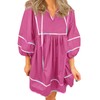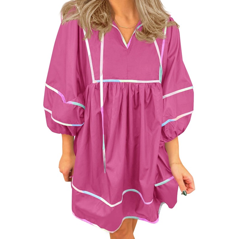 Cicy Bell Womens Babydoll Mini Dresses 3/4 Puff Sleeve V Neck Dress Casual Loose Fit Patchwork Pleated Swing Vacation Outfits Bright Pink