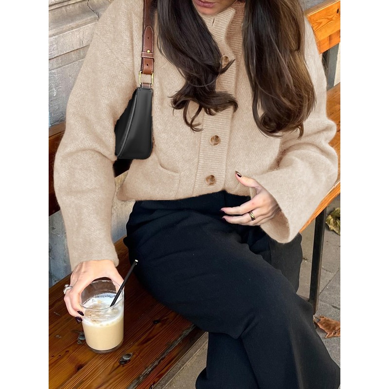 Cicy Bell Womens Chunky Knit Cardigan Sweaters Button Down Mock Neck Open Front Jacket Winter Casual Outerwear with Pockets Beige