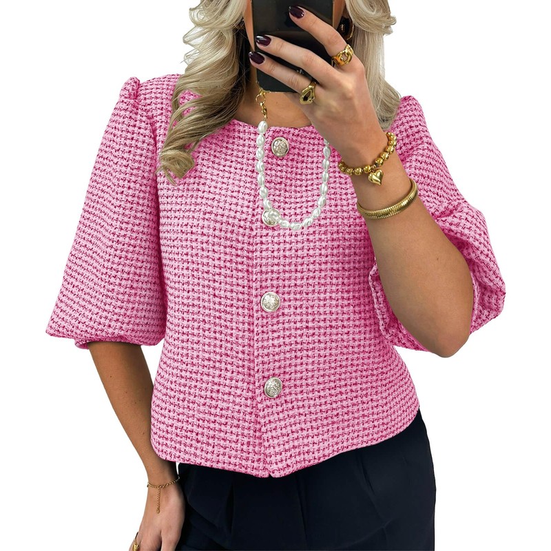 Cicy Bell Womens Cropped Tweed Blazers Puff Short Sleeve Crew Neck Button Business Casual Suit Jackets Pink