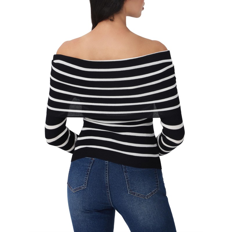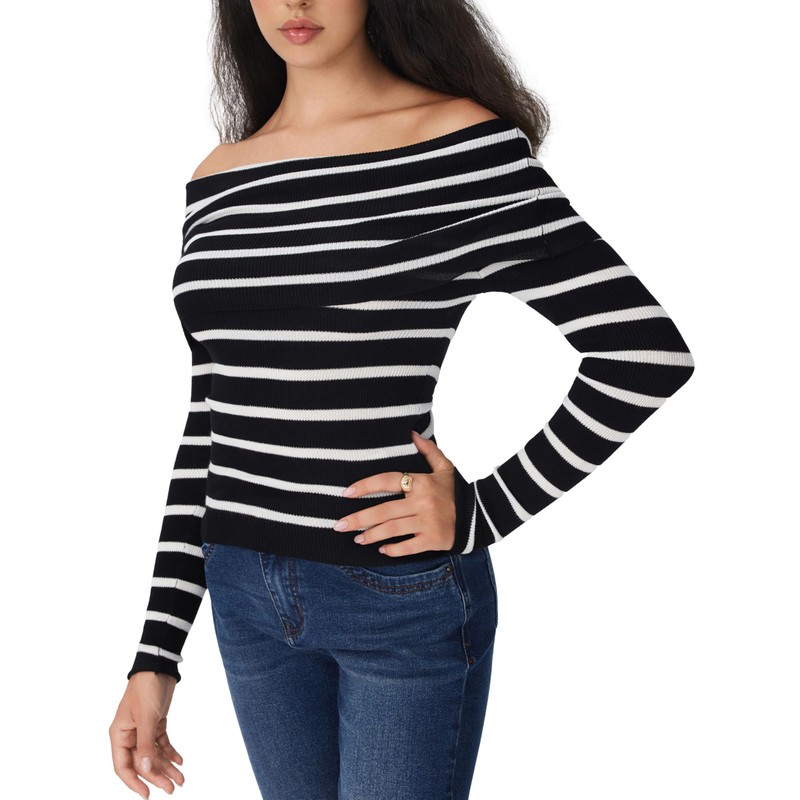 CIDER Striped Off The Shoulder Long Sleeve Knit Sweaters Going Out Fall Tops: Black & White, M