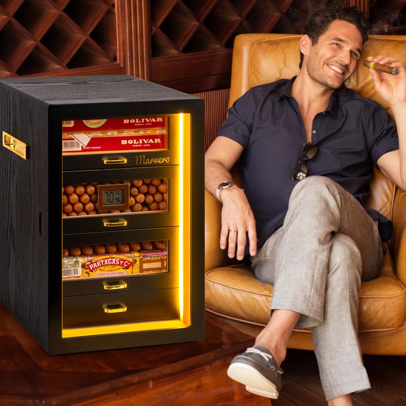 - 【MARVELOUS DESIGN】: Marvero humidor crosses into new terrain by adapting Rounded cabinet design, Brown walnut drawer and double side gold-plated hardware. These improvements make our humidor unique in the market