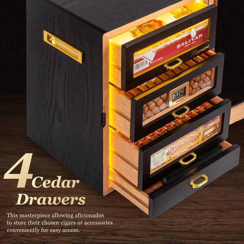 Cigar Humidor, Desktop Cigar Humidor Cabinet Triple-Sided Light with Digital Hygrometer, Humidifier and Humidity Packs. 4 Ceder Wood Drawers, Cigar Humidor Box can Hold 200 Cigars,Present for Men