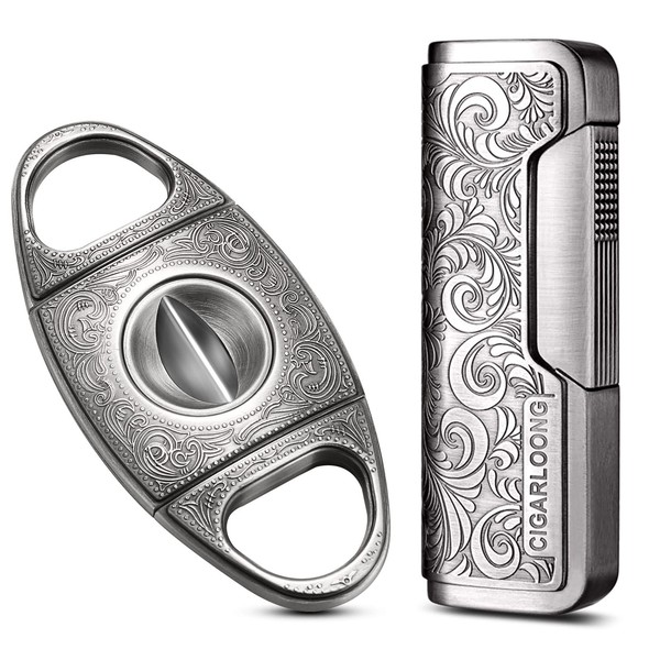CIGARLOONG Cigar Cutter and Lighter Set Sharpening Blade V Cut and Retro Carved Lighter(Silver1)