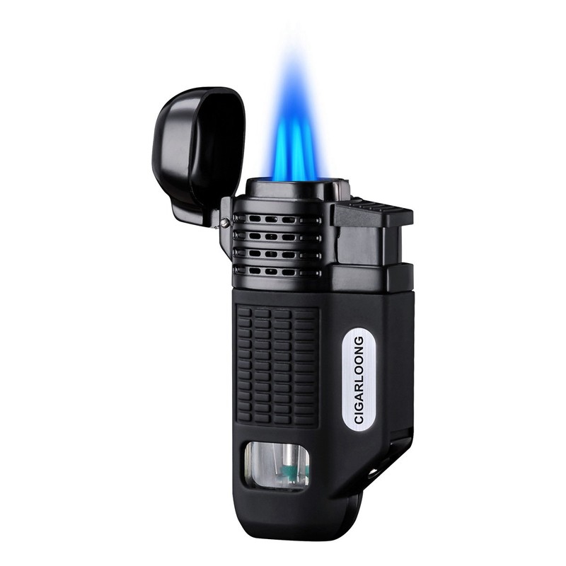 CIGARLOONG Cigar Lighter 4 Jet Torch Blue Flames Refillable Butane Torch Lighter with Cigar Punch (Color:Black)