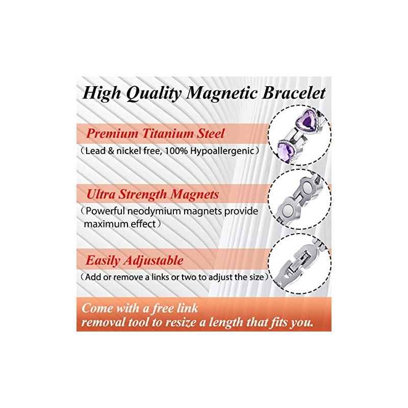 - Premium Titanium Steel: Titanium magnetic bracelet womens is made of high quality titanium steel and top technology which is hypoallergenic, nickel and lead free, light weight and waterproof. This material has better corrosion resistance, durable and scratch resistant.