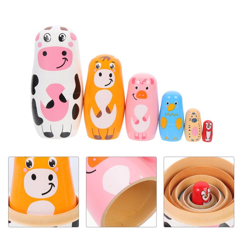 Ciieeo 1 Set Russian Wooden Matryoshka Dolls for Stacking Nested 6 Pieces Cute Cartoon Animal Pattern for Children Christmas and Birthday