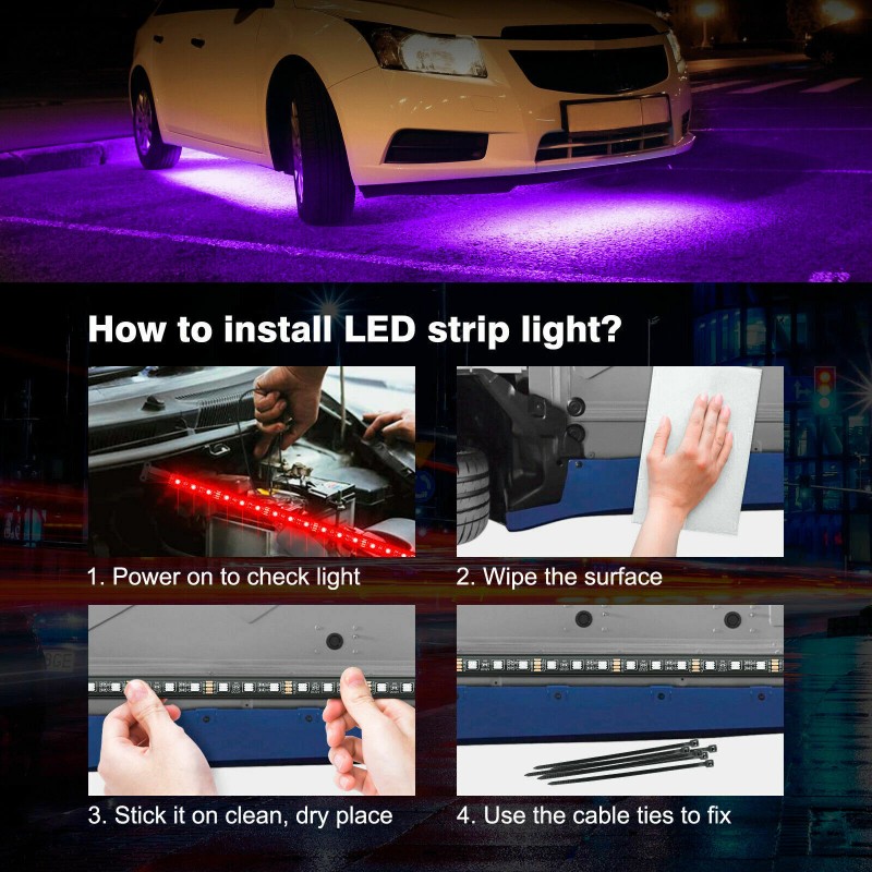 Easy to mount, simply peel off the double-sided tape behind each strip and apply the LED strips underneath your car. Used for 12V Cars, SUV, Vans, Trucks decoration.