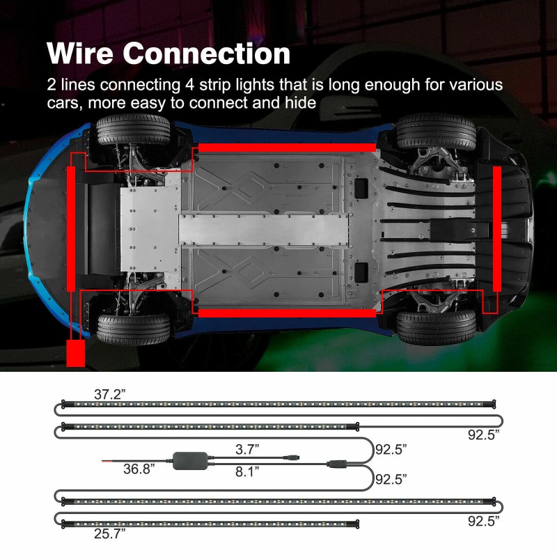 Car Underglow Lights add a stylish look to your love car at night!With 16 million vibrant colors and multiple dynamic lighting modes to customize your car apperance, a real head-turner!High brightness, amazing lighting effects, lighting up the entire under car, create fantastic atmosphere and give you a good mood.Easy to set-up, no need to modify the wiring, simply peel off the double-sided tape behind each strip and apply the LED strips underneath your car. Universal fit for cars with DC 12V power source.