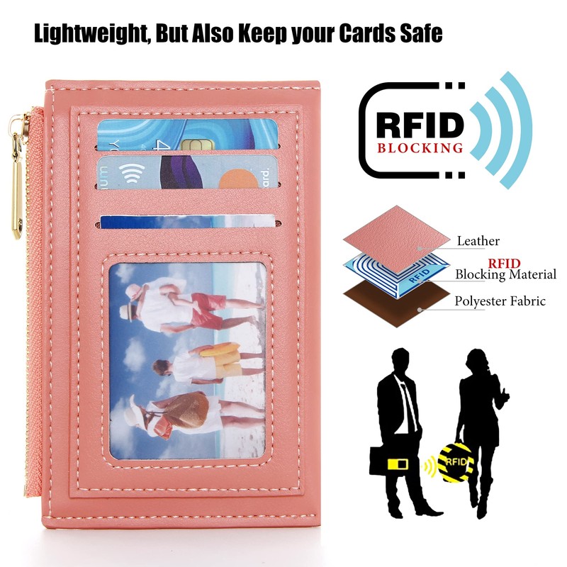 CILLA Womens Slim Wallet RFID Card Case Minimalist Small Card Wallet with Zipper Coin Pouch, Pink, Minimalist