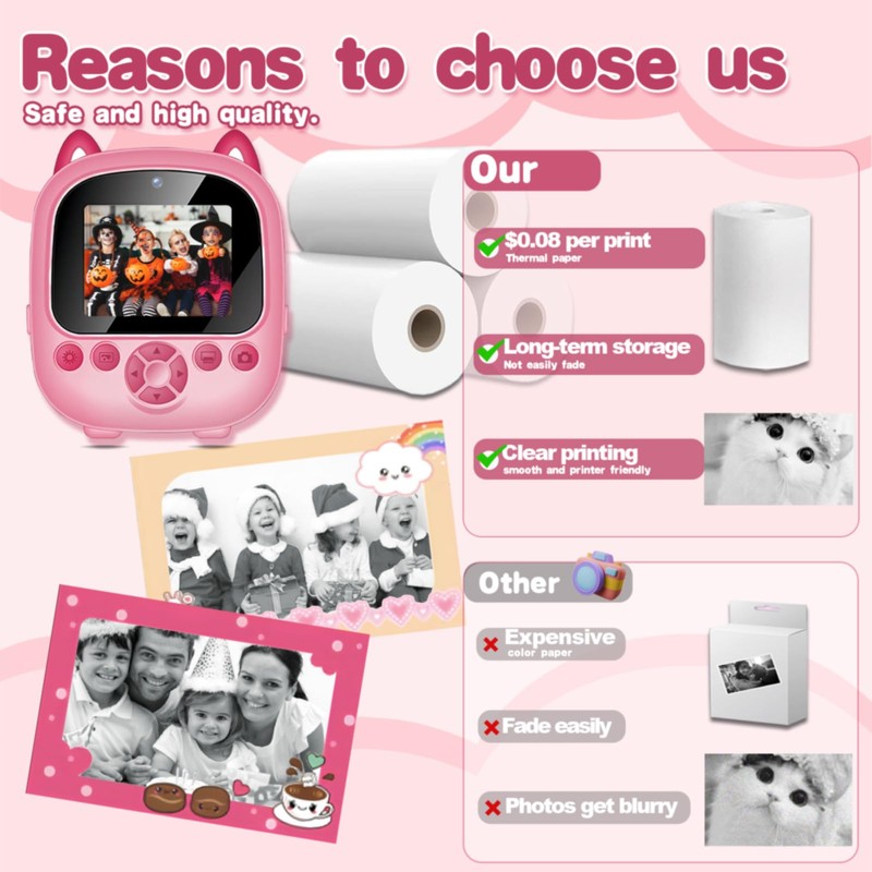 - Safe Print Paper: The material of this kids camera printing paper is safe and environmentally friendly, without toner, odorless and non-toxic, which is safer and more comfortable for children's skin.It is BPA free.Parents don't need to worry about affecting children's health.