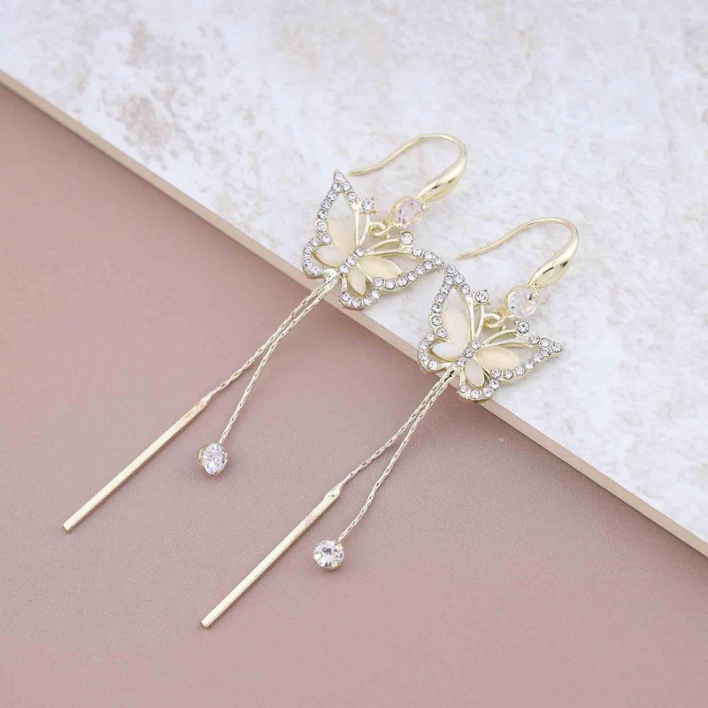 Cimenexe Bohemian Crystal Butterfly Tassel Dangle Earrings Gold Moonstone Butterfly Drop Earrings Long CZ Butterfly Earrings Rhinestone Tassel Chain Earrings Jewellery for Women, Zinc, No Gemstone