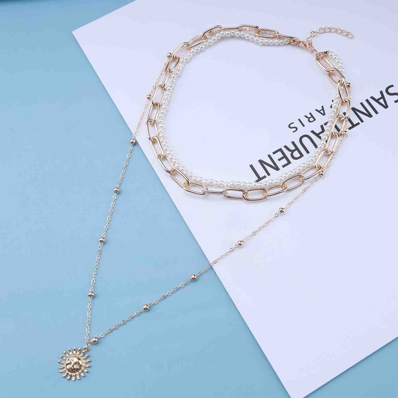 Cimenexe Bohemian Sun Pendant Necklace Layered Pearl Necklace Choker Paperclip Chain Necklace Gold Satellite Choker Necklace Jewelry for Women and Girls