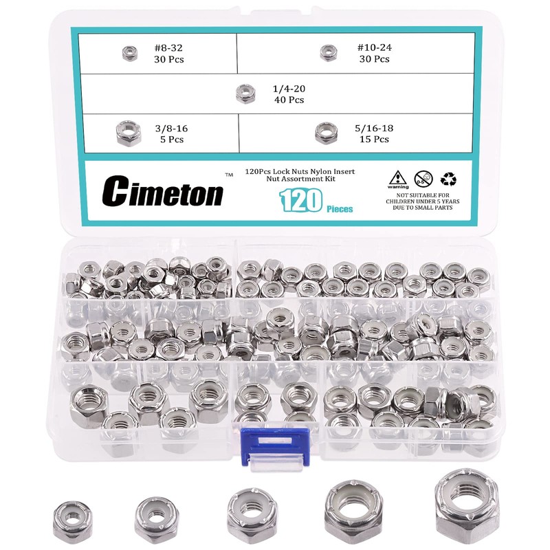 Cimeton 120Pcs 1/4-20 5/16-18 3/8-16 8-32 10-24 Hex Lock Nuts Nylon Inserted Hex Lock-Nuts Fasteners 304 Stainless Steel Assortment Kit