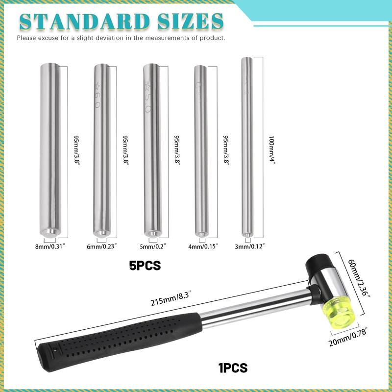- 🍂【Rich Sizes】Hammer rivet tools come with 5 different sizes, which are 8mm x 95mm, 6mm x 95mm, 5mm x 95mm, 4mm x 95mm, 3mm x 100mm, meeting your different daily needs.