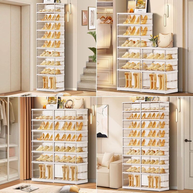 - Quick Installation: Collapsible plastic shoe boxes with lids is use integrated structure design, without any assembly tools.You can put it on the floor and pull it open like an accordion, that you can get a new foldable shoe box. Clear shoe boxes organizers your shoes with a minimal and modern style that blends with your room decor. Even a small space in the corner of the room will become elegant
