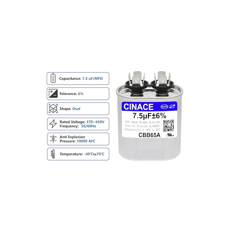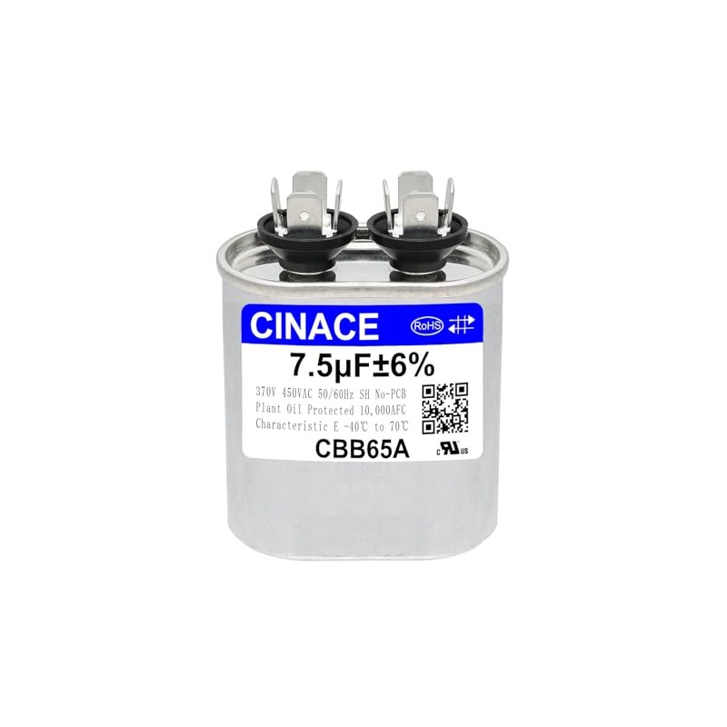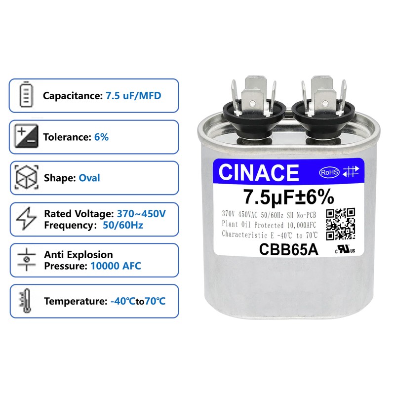 CINACE CBB65 Motor Run Capacitor, 7.5uF 370-450V, 50/60Hz, Oval Shape, -40°C to 70°C
