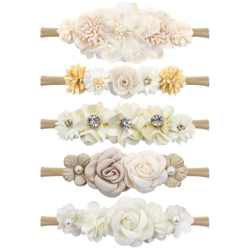 - Set of 5 special colours: these five different flower headbands show two main colours, including ivory and khaki. Fashionable colours are perfect for baby girls to match with their outfits at baby christening or photo shoots.