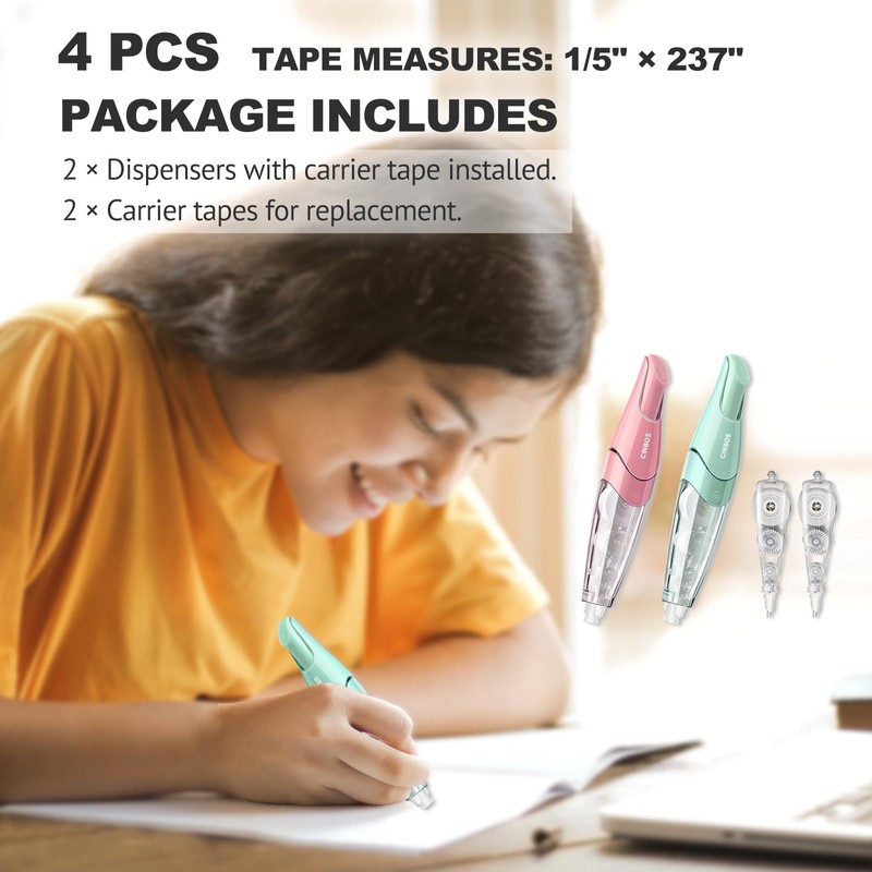 - Tape Measures: 1/5" (W) and 237" (L). Comes with 2 dispensers pre-loaded with carrier tape and 2 additional carrier tapes. Perfectly suitable for a wide range of applications, such as scrapbooking, greeting cards, letters, diaries, and various office writing and correction needs.