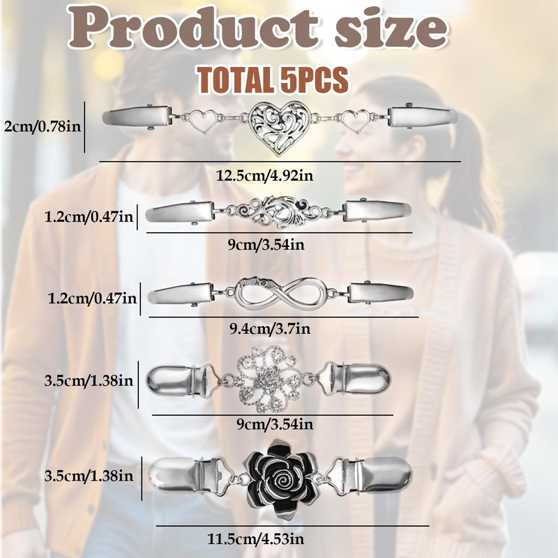 Cinch Clip Set - 5PCS Women’s Sweater and Dress Clips in 5 Styles (Heart, Horizontal Figure-8, Thumb, Rose, Diamond Flower), Premium Zinc Alloy Waist Cinch Belt Clips for Cardigans, Dresses,