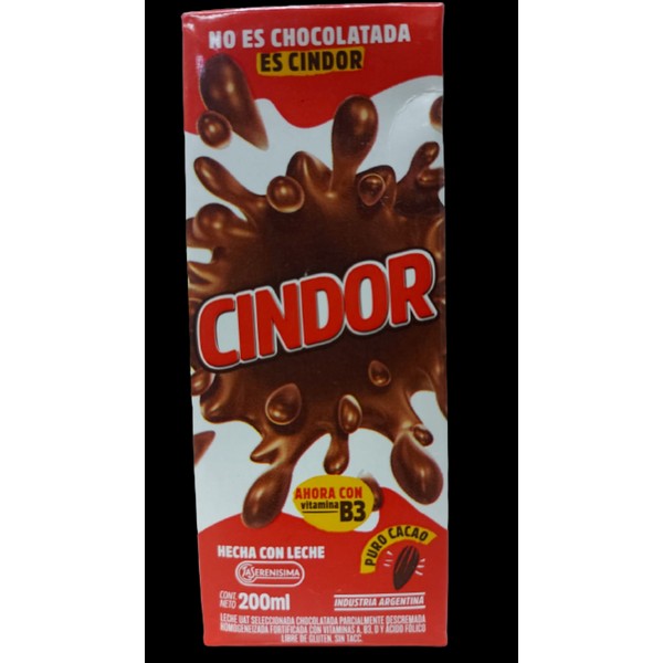 CINDOR leche uat seleccionada chocolatada parcialmente descremada homogeneizada fortificada con vitaminas a, d y ácido fólico. Libre de gluten, sin tacc.