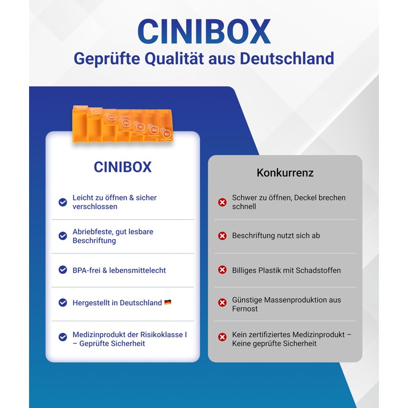 - 🔒 Patentierter Verschluss: Dank der innovativen Klickmechanik bleiben die Fächer sicher verschlossen und lassen sich dennoch mühelos öffnen. Perfekt für Senioren und Menschen mit eingeschränkter Handkraft.