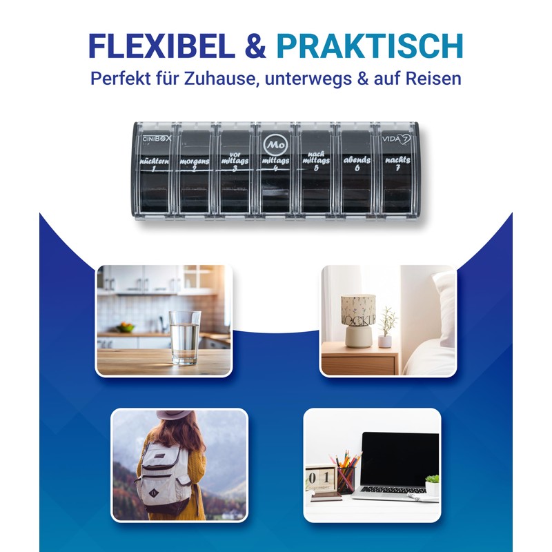CINIBOX VIDA 7 – Tablettenbox 7 Tage – Anthrazit – Pillendose & Medikamentenbox mit jeweils 7 Fächern – leicht zu öffnen & sicher verschlossen – BPA-frei & lebensmittelecht – Made in DE