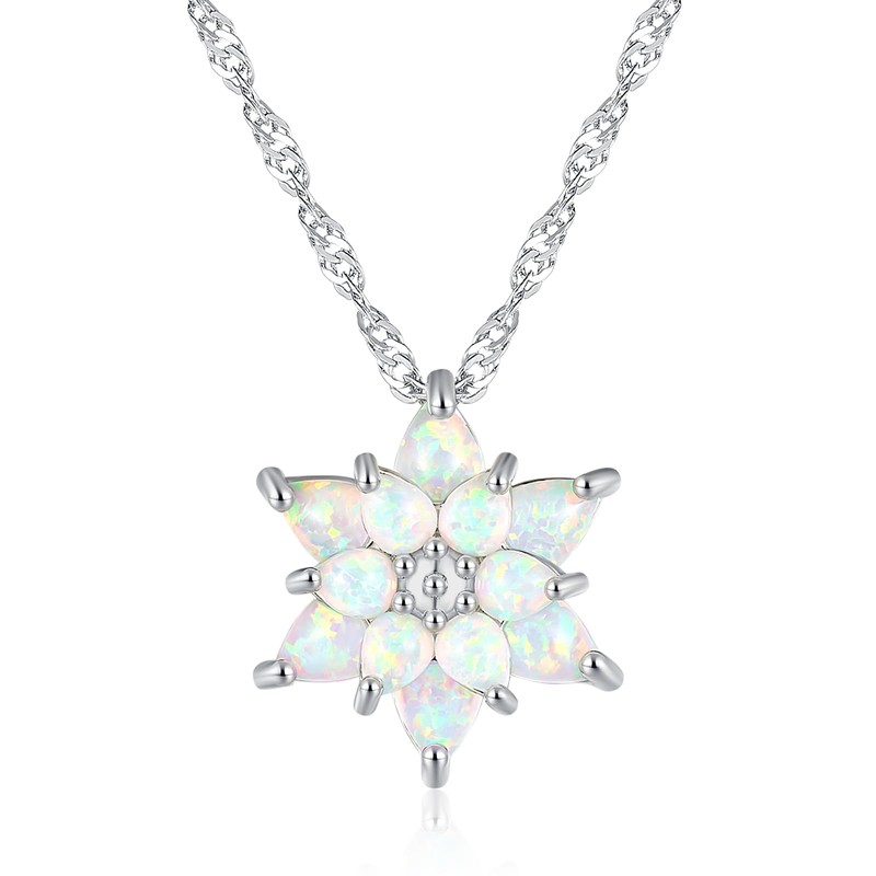 - Lotus Flower Opal Necklace: White gold plated flower opal pendant with box chain. This necklace shines on its own and is perfect for layering with other pieces from our flower jewelry collection