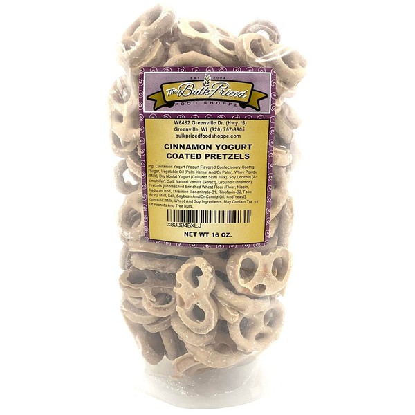 - CINNAMON YOGURT PRETZELS: The Bulk-Priced Food Shoppe’s cinnamon yogurt pretzels are an irresistible snack or dessert treat. If you love pretzels and cinnamon, then you’re going to love these! So unique you need to try them.