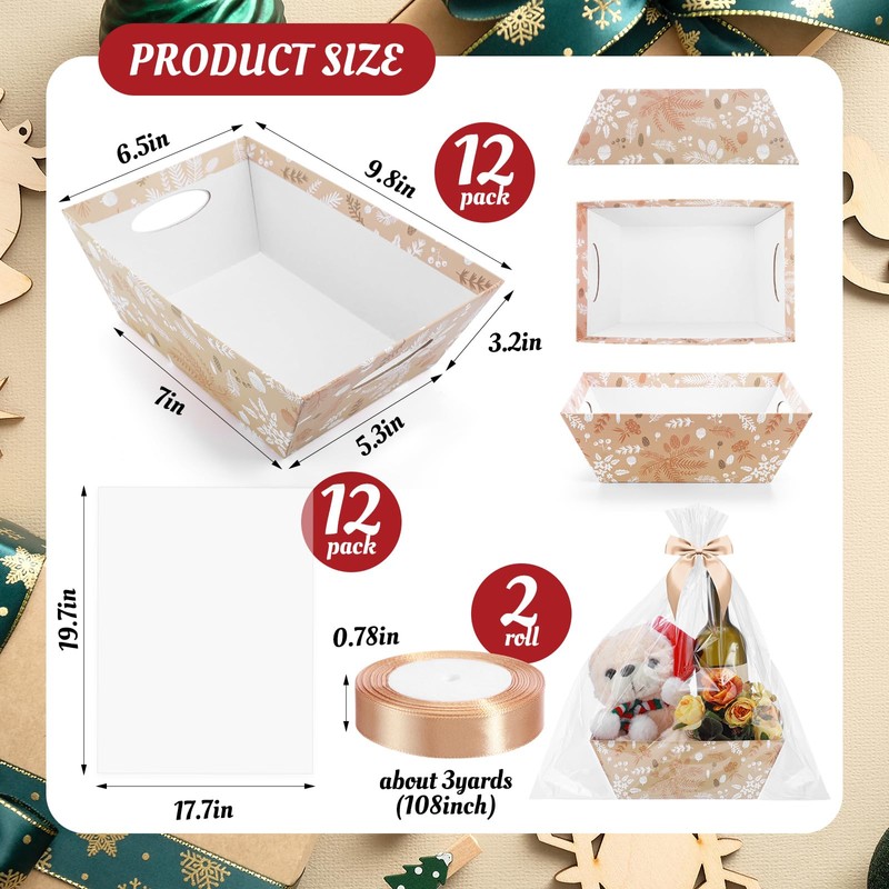 - Abundant Supply: This Christmas gift baskets empty kit includes 12 Christmas baskets, 12 basket bags and 2 roll of ribbon, which can easily meet your gift packaging or decoration needs; You can make exquisite gift baskets or decorate your home during the holidays
