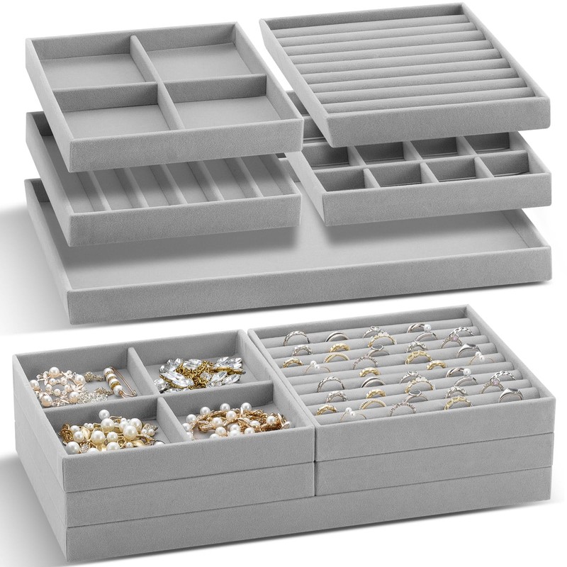 - Sufficient Quantity: the package includes 10 pcs stackable velvet jewelry trays, with 5 layouts, including 4 grid tray, 6 grid tray, 16 grid tray, 8 slot tray, 22 hook large tray, 2 pcs of each, which can store different jewelry; Made of soft yet sturdy velvet fabric, our jewelry trays are built to last and protect your jewelry from scratches and damage