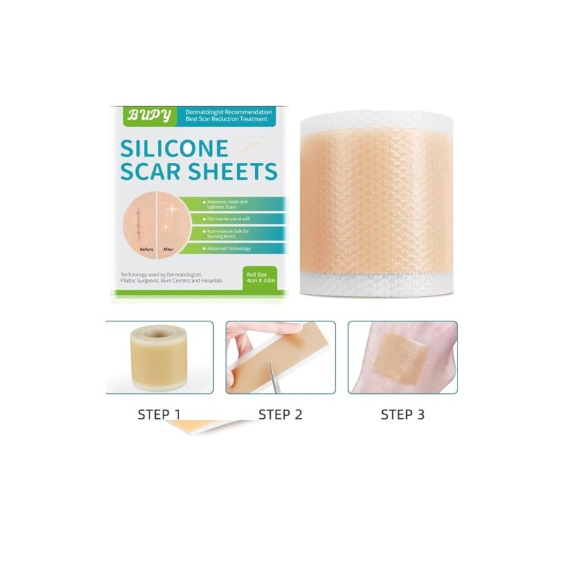 - Cinta de silicona de grado médico: la cinta de silicona para cicatrices está hecha de silicona suave de grado médico hospitalario. Elimina y aclara eficazmente las cicatrices viejas y evita la formación de nuevas cicatrices. Mejora su apariencia y textura en 4-8 semanas.