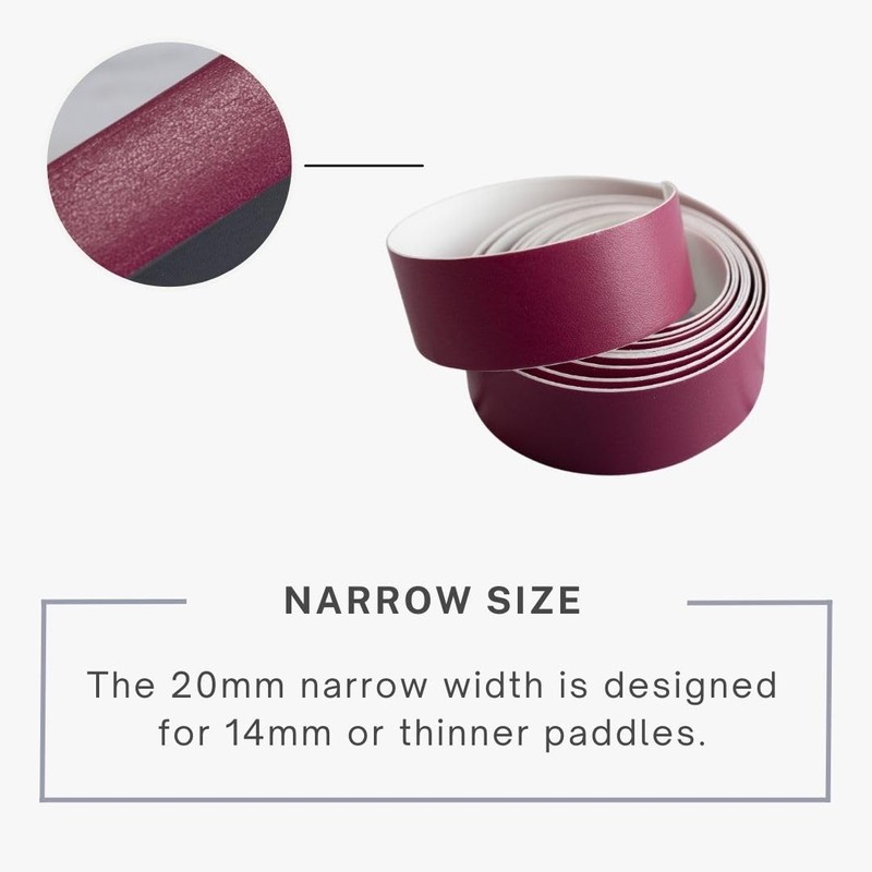 - 20 mm de ancho: este ancho protege el protector de borde de hasta 16 mm de ancho. Si se utiliza en una paleta de 16 mm, cubrirá completamente la parte plana del protector de borde pero no se envolverá alrededor del lateral.
