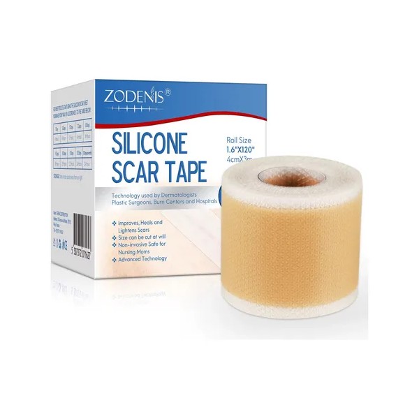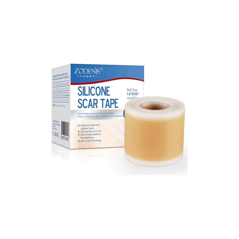 La cinta de silicona Zodenis es un producto médico diseñado para reducir la apariencia de cicatrices, incluyendo las causadas por cesáreas, cirugías, quemaduras, acné y queloides. Esta cinta, disponible en rollos de 1.6” x 120” (4 cm x 3.3 m), es reutilizable y flexible, adaptándose a diversas áreas del cuerpo.