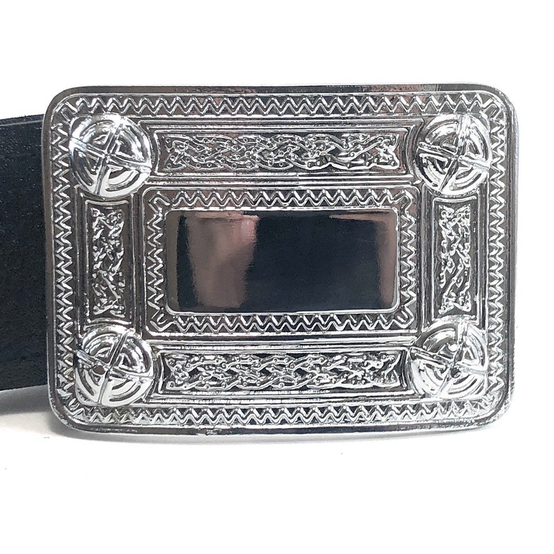 Cinturón de piel negro liso con hebilla cromada con diseño celta, Negro -, Medium