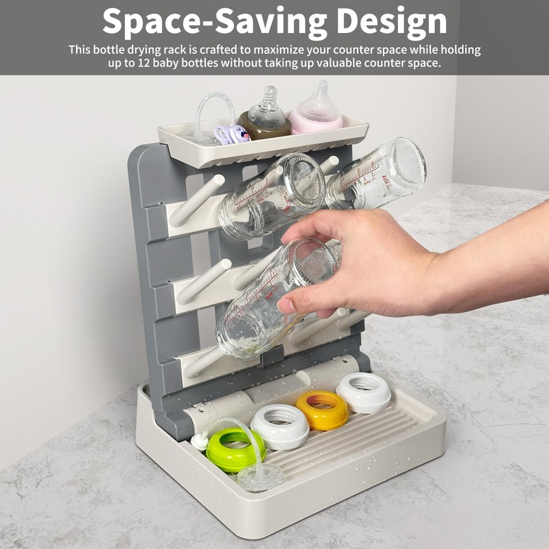 - 【Space-Saving Vertical Bottle Drying Rack】 Maximize your counter space with our vertical baby bottle drying rack, designed to hold up to 12 bottles along with all essential baby accessories in one compact spot. Easily dry bottles, pacifiers, pump parts, and nipples, saving you time and effort.