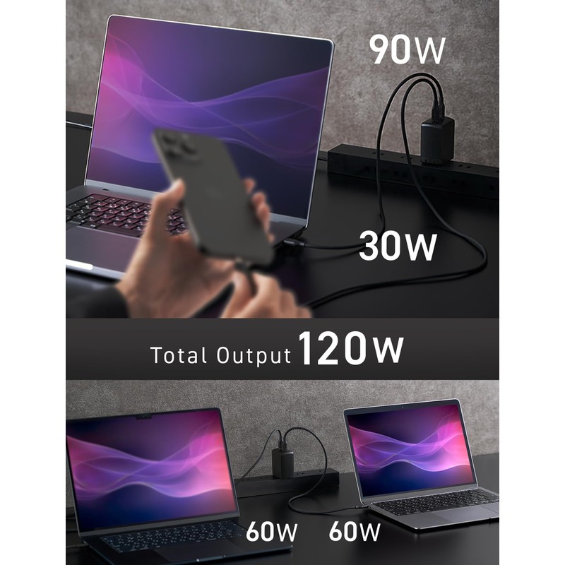 - 2 Ports: Equipped with 2 USB-C ports. When using 2 ports, it can charge 2 45W class laptops simultaneously or 90W + 30W rapidly. For details, please check the quick charge chart (picture)