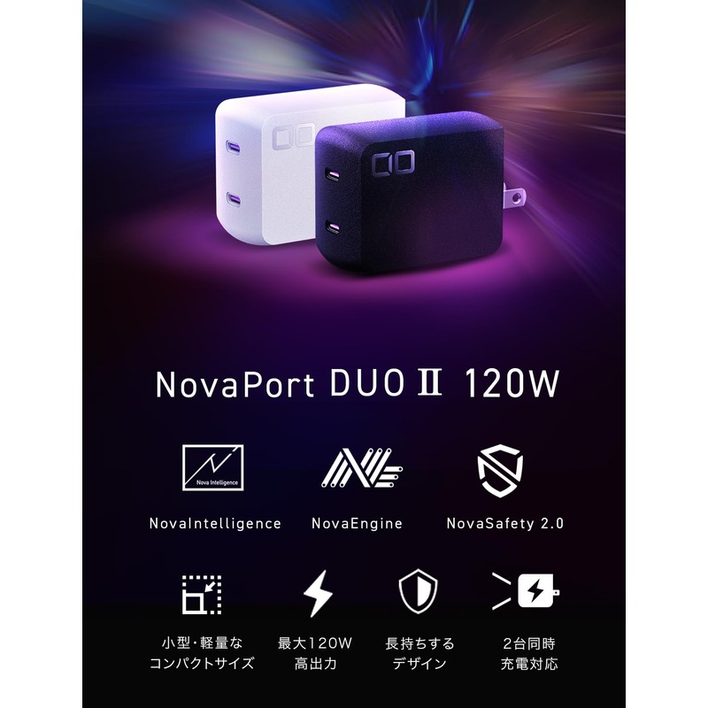 - (Equipped with NovaEngine) Adopts a next-generation semiconductor GaN chip to reduce energy loss and improve conversion efficiency. This charger suppresses heat generation, and pursues charging speed and stability