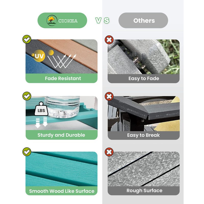 - Strong and Sturdy: Our plastic adirondack chairs are made of wood garin HDPE material, which is more resilient. When impacted by strong gravity, the CIOKEA HDPE plate will bend slightly and recover as the gravity disappears, while ordinary HDPE plate will bend severely and fail to recover, and HIPS plate will break. Ciokea Adirondack chairs can have a load capacity of 380LBS.