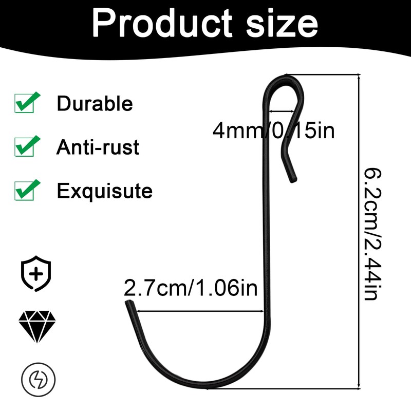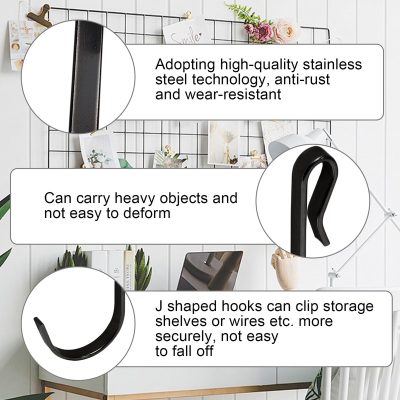 - J-Shaped Design: Unlike traditional "S" shaped hooks, our J-shaped hooks securely clamp onto storage racks and wires, reducing the risk of slipping or falling.