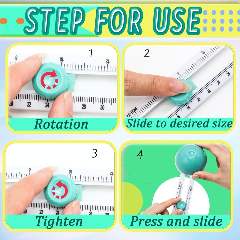 - Easy to Use: The circle paper cutter is simple to use. Set the size by unscrewing, sliding up and down, and then tightening cap on the ruler. Then put the circle cutter on the paper and rotate it to get the round shape you want. (Refer to the steps in the picture)
