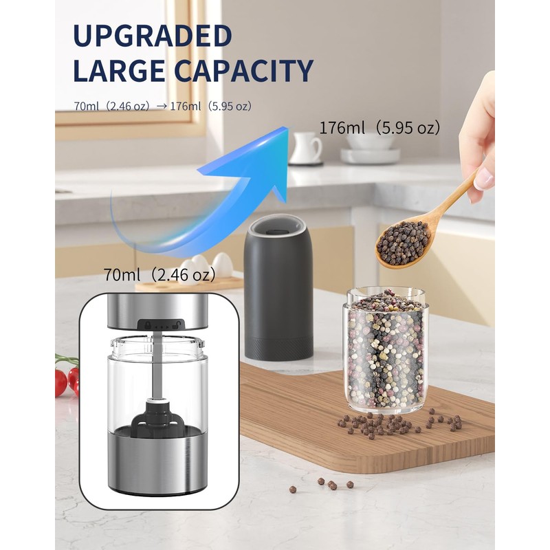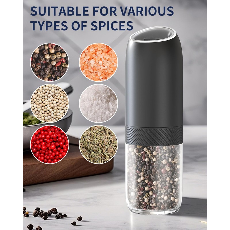 - Smart Grinding with Gravity Sensor - Experience effortless one-handed operation with smart gravity sensor technology. Simply tilt the electric pepper grinder over your dish, and it automatically starts grinding, eliminating the need for buttons or manual twisting. Perfect for busy chefs or those with limited grip strength, this feature ensures precise control and fresh seasoning every time
