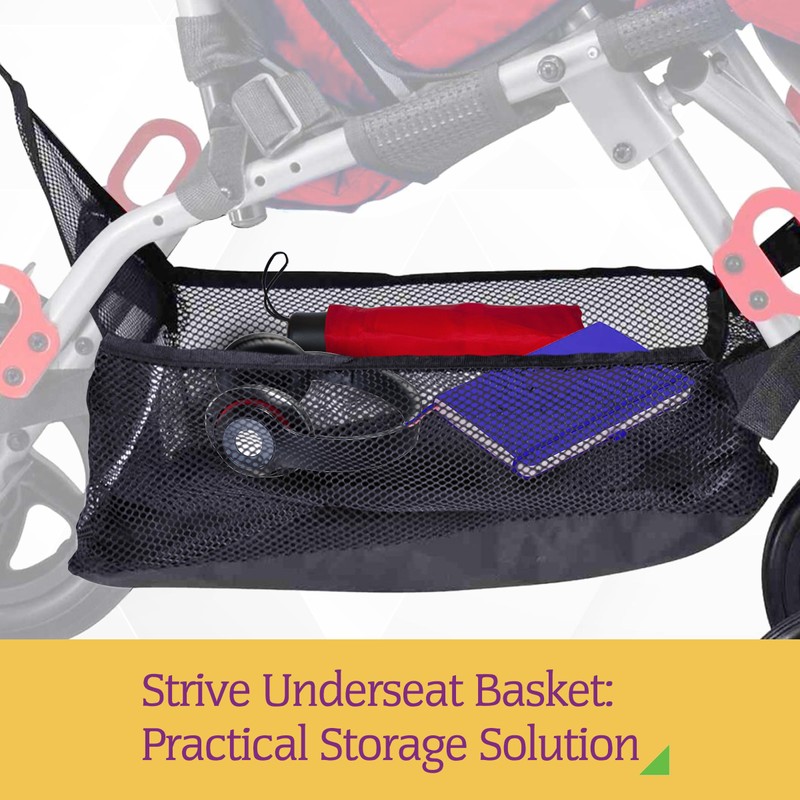 - Perfect Fit: Designed exclusively for Circle Specialty's Strive Adaptive Special Needs Strollers, this under-seat basket fits seamlessly with all four Strive stroller sizes, offering a versatile and reliable storage solution for parents on the go.